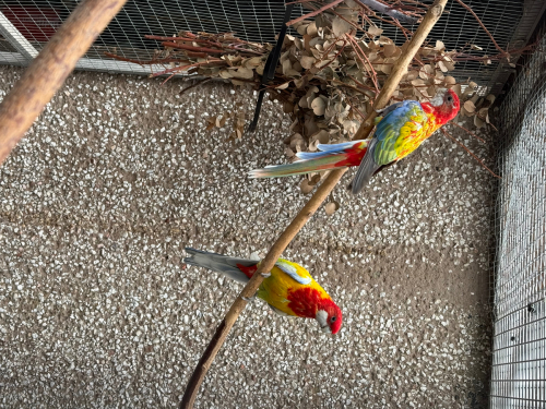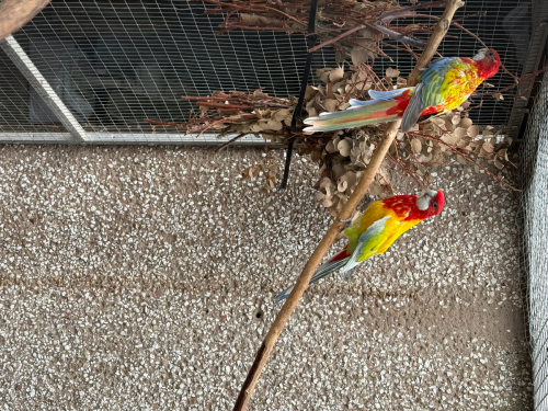 Mutation rosella pair.Golden gold,white wing cockbird x opaline split golden gold hen.just finishing moult so they look a bit scruffy in the photos.cockbird not rung.£230pair.