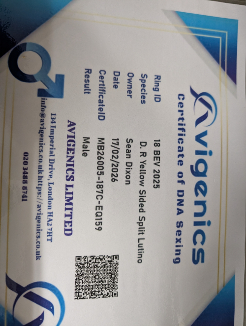 Dominant red split lutino start of 2025 bird rung and dna cock bird 500