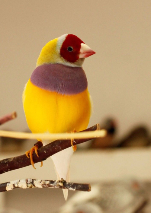yellow gouldian, red head and purple breast